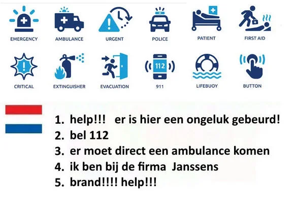 Call an emergency number and if possible, warn your boss or the special person who is trained to help in such a situation. (in Dutch, we call that person a BHV’er. Explain what has happened and where. If possible, also inform your supervisor.
